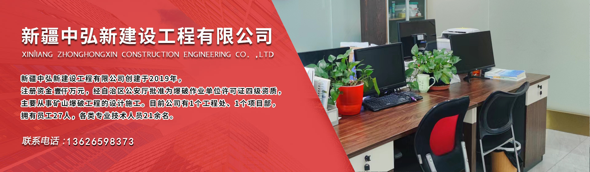 ZHONGHONGXIN CONSTRUCTION ENGINEERING 公 司 簡 介新疆中弘新建設(shè)工程有限公司創(chuàng)建于2019年,注冊資金壹仟萬元,經(jīng)自治區(qū)公安廳批準(zhǔn)為爆破作業(yè)單位許可證四級資質(zhì),主要從事礦山爆破工程的設(shè)計施工、礦上采掘施工業(yè)務(wù)。目前公司有1個工程處、2個項目部,分...